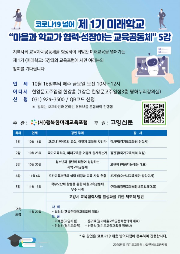 새로운 교육정책 대안을 모색하기 위해 활동을 펼쳐온 행복한미래교육포럼은 창립 12주년을 맞아 코로나19 국면을 극복하고 대안을 찾는 <미래학교>를 개설합니다.