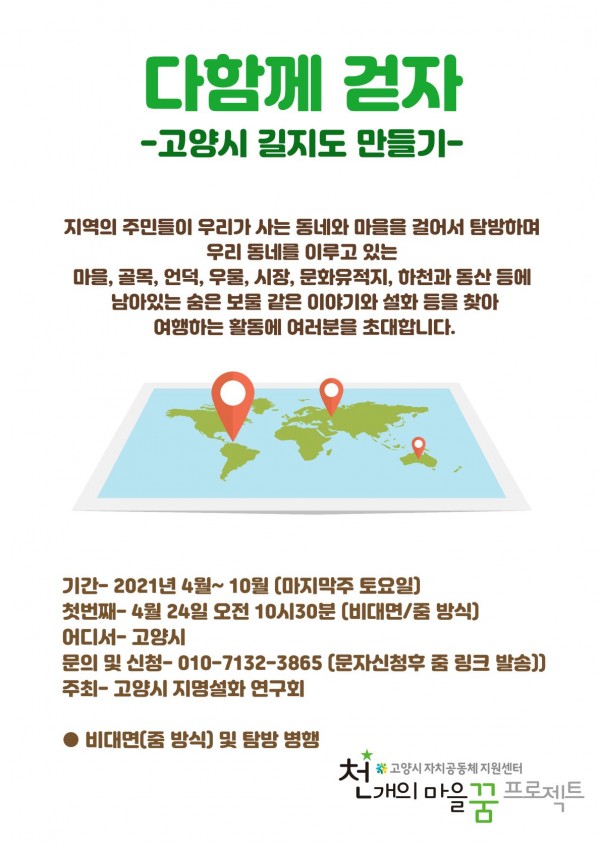 지역의 주민들이 우리가 사는 동네와 마을을 걸어서 탐방하며 우리 동네를 이루고 있는 마을, 골목, 언덕, 우물, 시장, 문화유적지, 하천과 동산 등에 남아있는 숨은 보물 같은 이야기와 설화 등을 찾아 여행하는 활동에 여러분을 초대합니다.