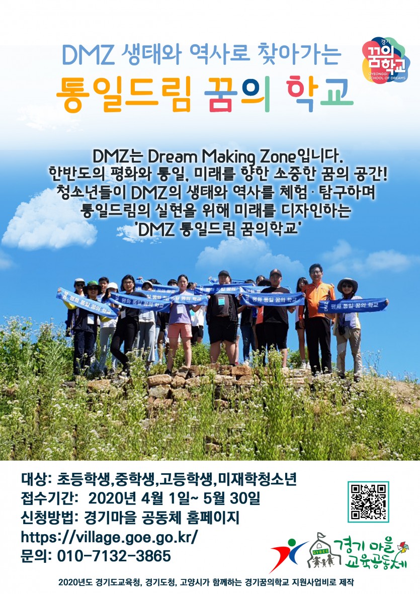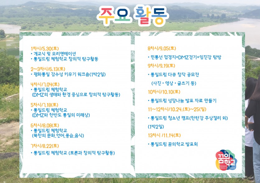 생태 감수성과 평화 감수성을 키우고, 평화로운 한반도의 비전을 꿈꾸며 미래의 지도자로 더불어 성장하는 통일드림 꿈의학교로 초대합니다.